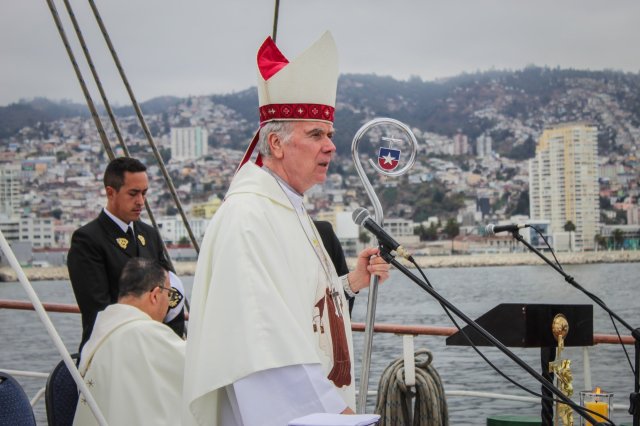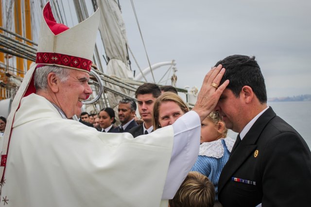 Valparaíso. Durante la jornada del viernes 10 de abril, la dotación del Buque Escuela "Esmeralda" efectuó una Misa de Campaña a bordo de la unidad, la cual fue presidida por el Obispo Castrense de Chile, General de Brigada Monseñor Pedro Ossandón, junto al Comandante del buque, Capitán de Navío Edward Gibbons.