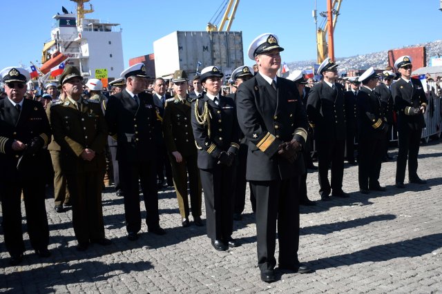 La dotación, al mando del Capitán de Navío Edward Gibbons, está conformada por 269 personas, de las cuales 35 son mujeres, nueve Oficiales extranjeros invitados, cinco Oficiales de las otras ramas de las Fuerzas Armadas, de Orden y Seguridad Pública y Marineros de la Armada de Chile.