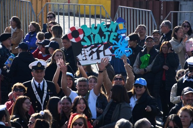 Como ya es tradicional, la “Dama Blanca” fue despedida por los pitos y sirenas de las naves surtas en la bahía junto a embarcaciones menores que la acompañaron por la costa; además de cerca de 1.700 personas, entre las que se encontraban familiares y amigos que llegaron con banderas chilenas, globos y pancartas con mensajes de despedida.