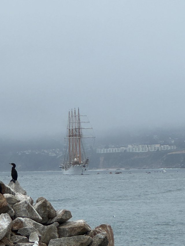 Al finalizar la maniobra velera, el buque fondeó en Algarrobo, siendo recibido por cientos de personas a bordo de diversas embarcaciones, lo que también fue observado desde la costa. Posterior a la recalada, se recibió a bordo al Capitán de Puerto de Algarrobo, Capitán de Corbeta LT Sergio Sánchez.